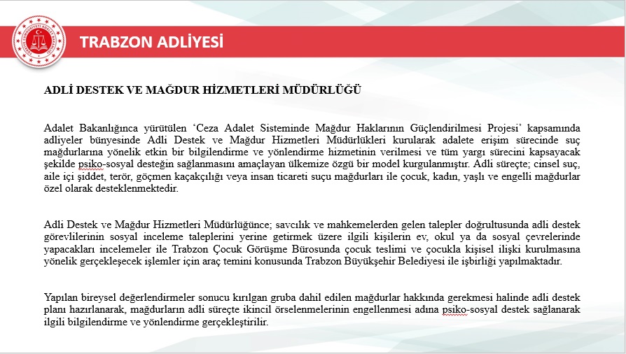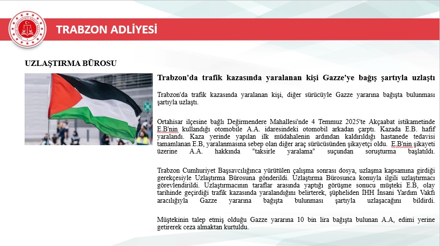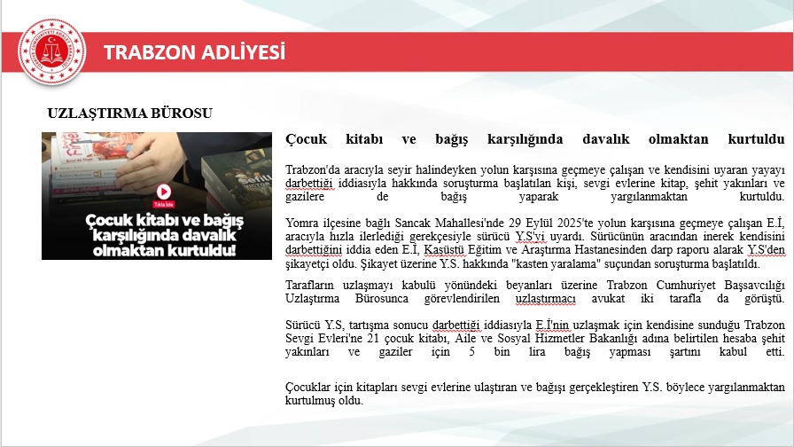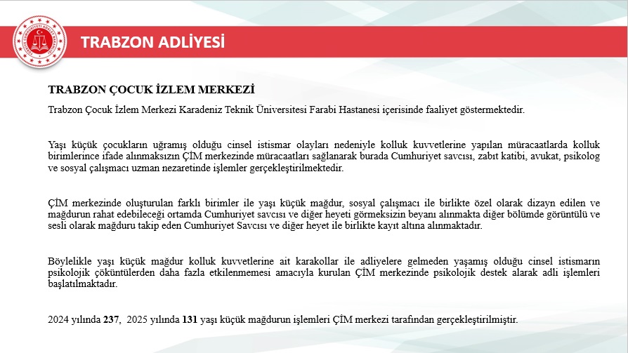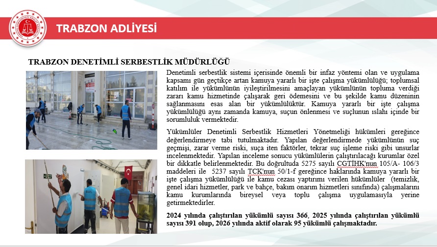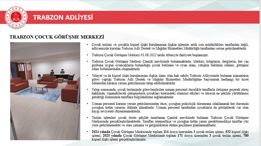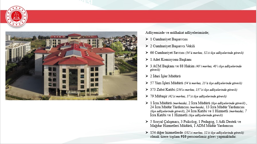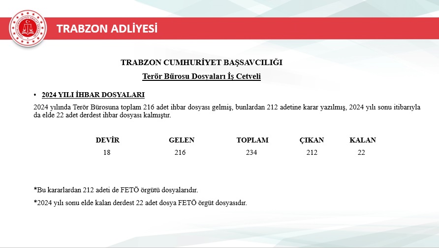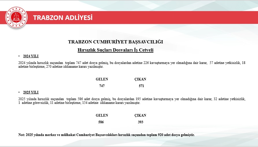 2025 yılı içerisinde Trabzon merkez ve ilçelerinde toplam 46.750 yeni dosya sisteme girdi. Geçmiş yıllardan devreden dosyalarla birlikte toplam işlem gören dosya sayısı 72.967’ye ulaştı. Aynı yıl içerisinde 48.213 dosya karara bağlanarak sonuçlandırıldı. Böylece dosya çözüm oranı, gelen dosya sayısının üzerine çıkarak %103 seviyesine ulaştı. Yıl sonu itibarıyla 24.754 dosya karara bağlanmayı beklerken, bu performans adliyenin işleyiş verimliliğinde önemli bir başarı olarak değerlendirildi.