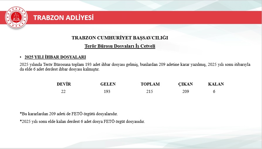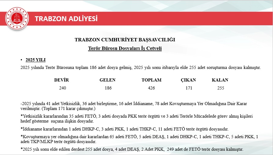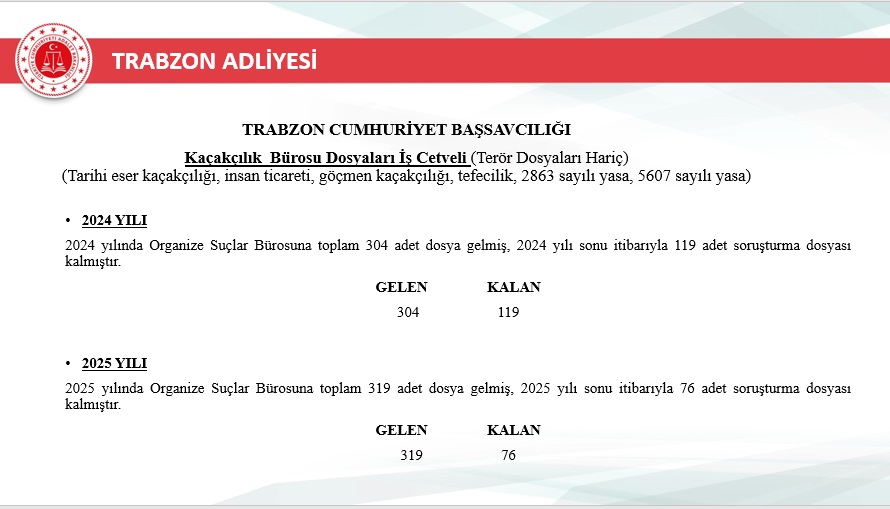 Trabzon’da 2025 yılı içinde terörle ilgili 234 dosya, göçmen kaçakçılığıyla ilgili ise 319 dosya işlem gördü. Bu alanlarda hassasiyetle çalışıldığını belirten Başsavcı Çelik, yargı ve güvenlik birimlerinin koordineli hareket ederek süreci dikkatle yürüttüğünü ifade etti.