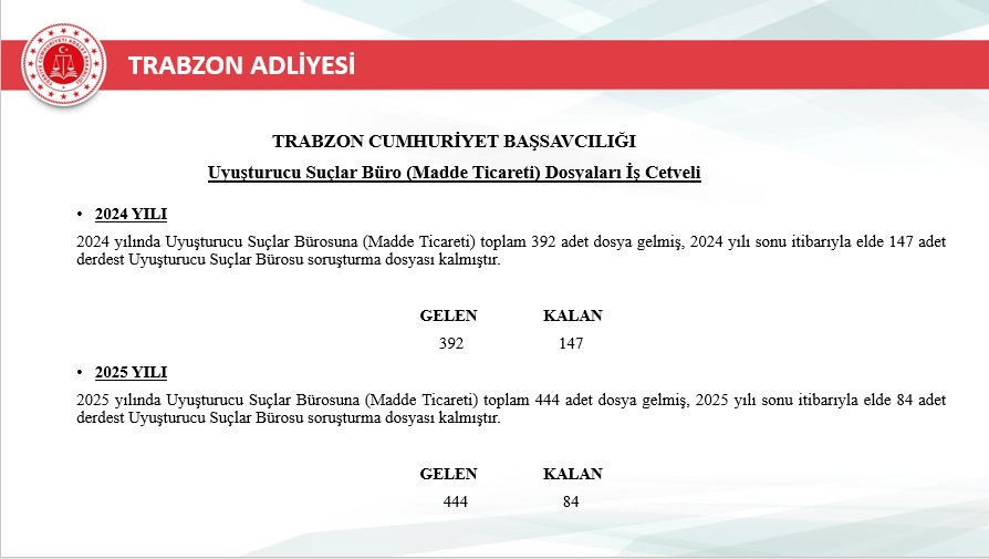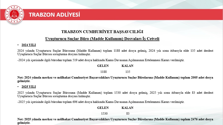 2024 yılında 1.118 olan uyuşturucu kullanımıyla ilgili dosya sayısı, 2025’te 1.530’a yükseldi. Artışa dikkat çeken Başsavcı, emniyet ve jandarmanın özverili çalışmalarına rağmen toplumsal farkındalığın hâlâ yetersiz olduğunu söyledi.