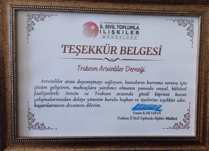 Trabzon İl Sivil Toplumla İlişkiler Müdürü Yunus Karaman tarafından Trabzon Artvinliler Derneği Başkanı Ahmet Külekçi’ye takdim edilen “Teşekkür Belgesinde” şu ifadeler yer aldı “Artvinliler arasında dayanışmayı sağlayan hastaların barınma sorunu için çözüm geliştiren muhtaçlara yardımcı olmanın yanında sosyal kültürel faaliyetlerle Trabzon ve Artvin arasında gönül köprüsü kuran çalışmalarınızdan dolayı yönetim kurulu başkan ve üyelerine teşekkür eder başarılılarınızın devamını diliyorum”