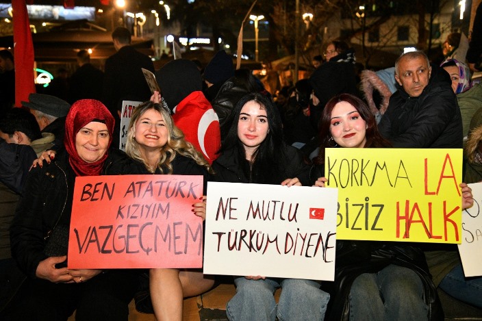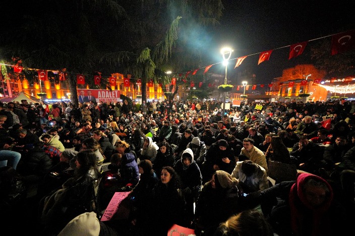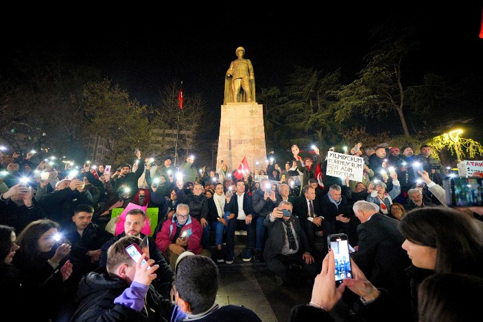 Meydan Parkı’ndaki Atatürk Anıtı önündeki toplanan her yaştan ve görüşten yüzlerce vatandaş, Ekrem İmamoğlu’na yapılan haksızlığa karşı, oturma eylemi gerçekleştirdi. Eylemde, Ekrem İmamoğlu’nun Silivri cezaevinden yazdığı mektup ve mesajları okunurken, vatandaşlar, “Hak, Hukuk, Adalet” sloganları attı, Ekrem İmamoğlu’nun bir an önce özgür bırakılmasını istedi.