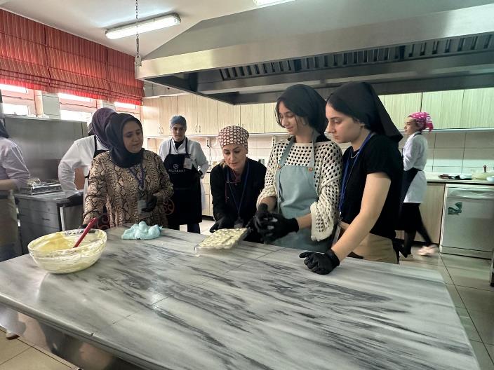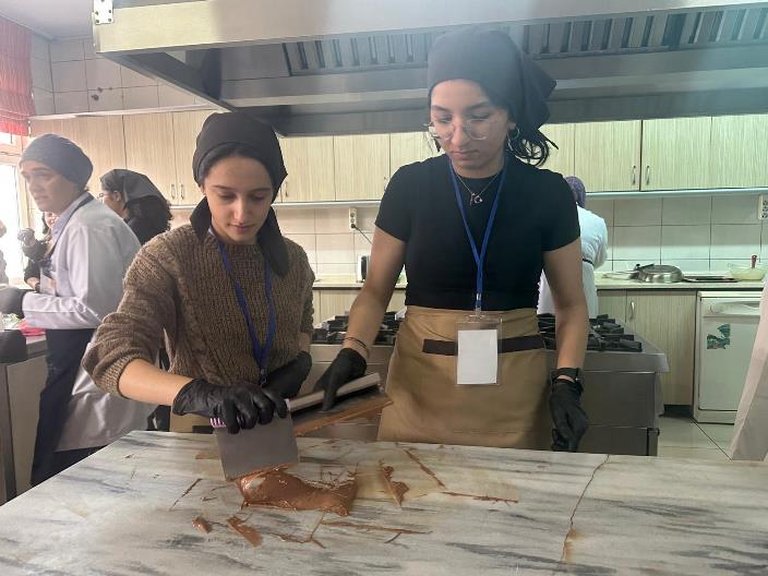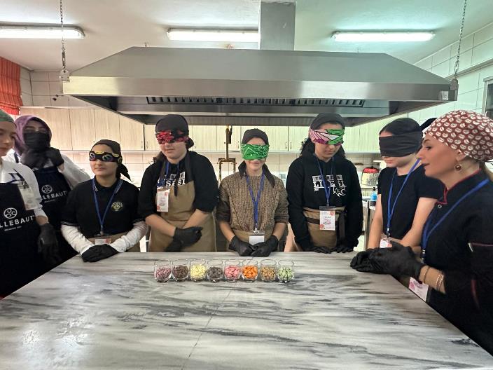 Ardından, son dönemlerin popüler çikolata çeşitleri arasında yer alan Trabzon çikolatası ve Dubai çikolatası üzerine uygulamalı çalışmalar yapıldı. Çikolatalar, üç farklı dolgu çeşidi kullanılarak hazırlandı ve öğrencilerle birlikte tat-aroma odaklı bir kör tadım testi gerçekleştirildi. Ayrıca, öğrencilerle birlikte yaratıcı bir çikolata panosu hazırlandı.