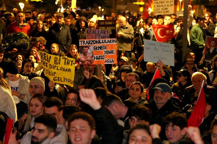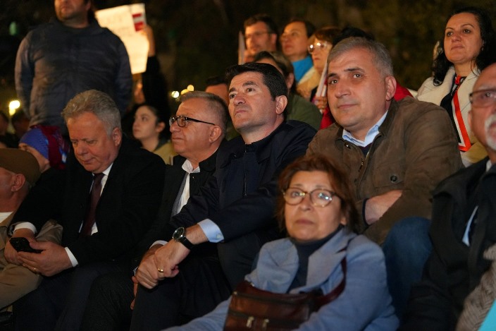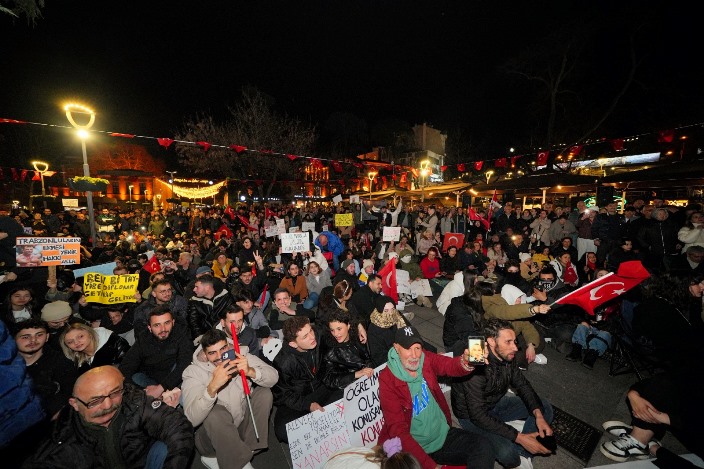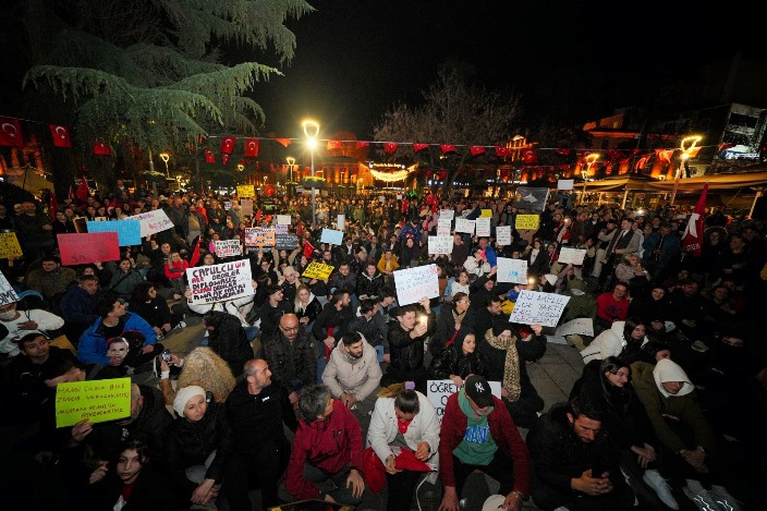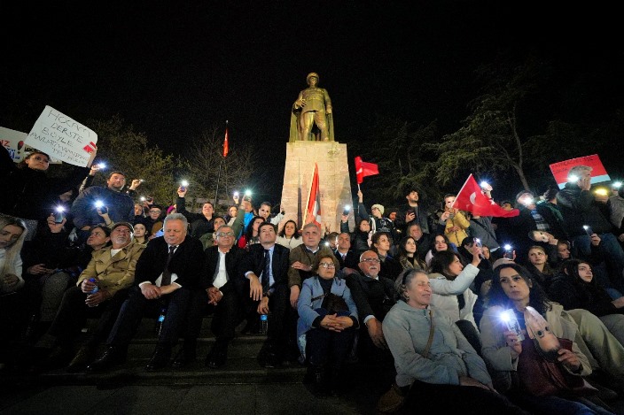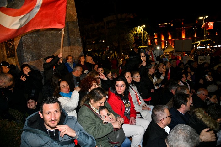 İmamoğlu’nun hemşerileri, bu akşam da Adalet Nöbeti için Kahramanmaraş Caddesi’nden “Milletin İradesine Sahip Çıkıyoruz” yazılı pankartla, Meydan Parkı’na yürüdü. Yaşanan haksızlık ve hukuksuzlukları protesto eden ve “Kurtuluş yok tek başına, ya hep beraber ya hiçbirimiz” sloganları atan vatandaşlar, Atatürk Anıtı önünde oturma eylemi gerçekleştirdi.