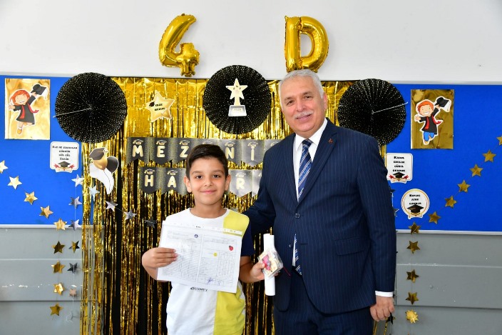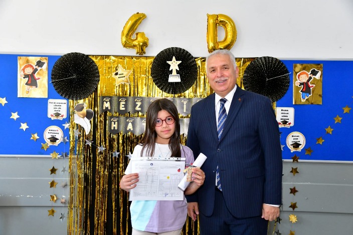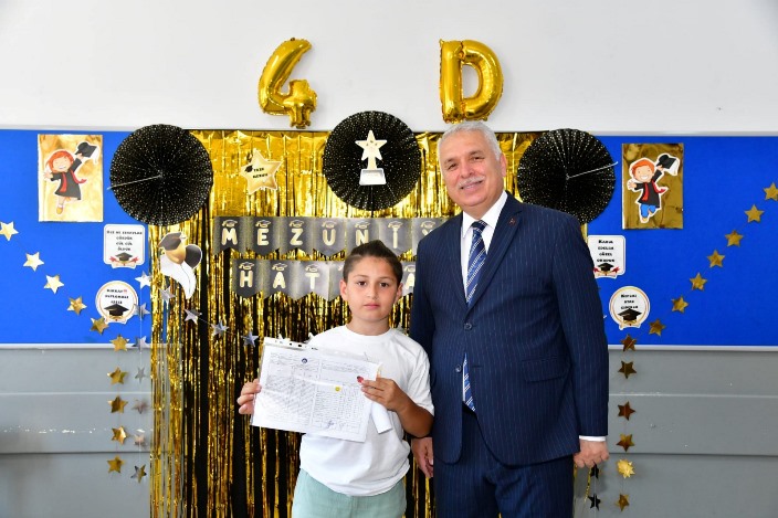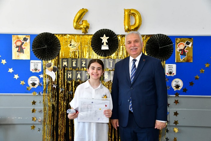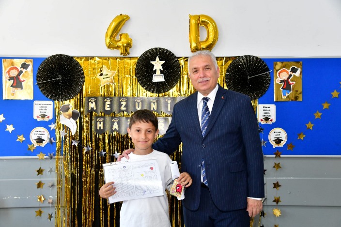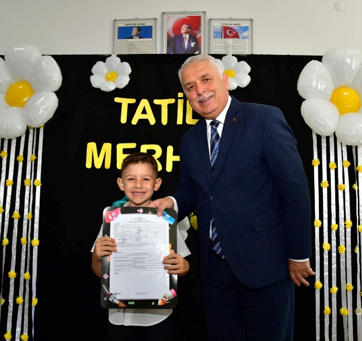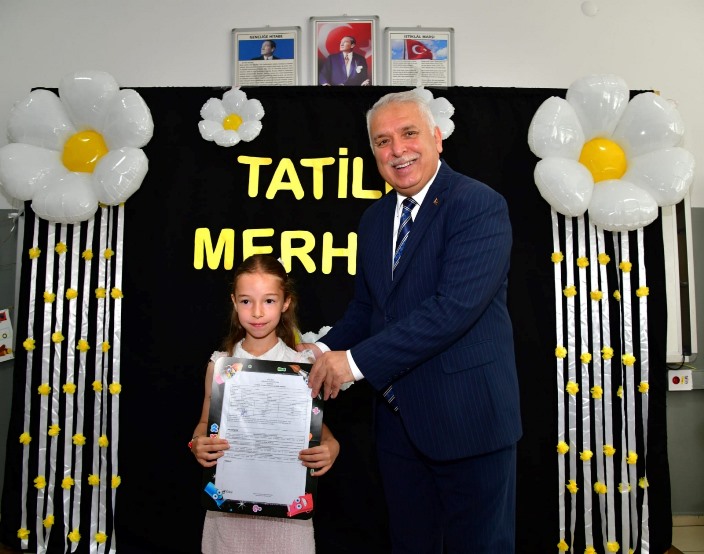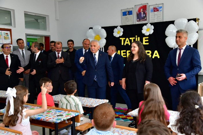 Sınıfları gezerek öğrencilerle birebir ilgilenen Vali Yıldırım, karne ve başarı belgelerini takdim ederek çocuklara yaz tatili için iyi dileklerde bulundu.