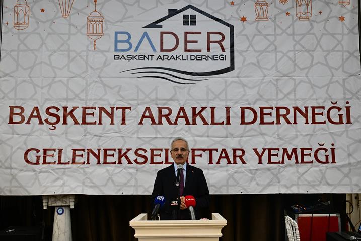 Başkent Araklı Derneği tarafından Gazi Üniversitesi Kültür Merkezi’nde organize edilen iftar yemeğine katılan Bakan Uraloğlu, Ramazan ayının bereketini paylaşmak için düzenlenen iftar yemeklerinin birlik duygusunu güçlendirdiğini ifade etti. Bakan Uraloğlu, “Bizleri bir araya getiren sadece memleket sevgisi de değil, aynı zamanda birbirimize duyduğumuz derin saygı ve muhabbettir. Aslolan kaynaşmak, kucaklaşmak, hasret gidermek. Bu muhabbetimizin hiç bozulmamasını temenni ediyorum.” dedi.