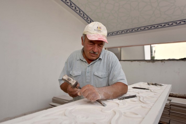 Hayri Dertlioğlu, “Trabzon’un Akçaabat ilçesinde yaşıyorum. Mesleğe kendi köyümde çeşitli camileri yapan Alican Usta ve çocuklarının yanında başladım. Mimar Sinan’ın eserlerini gittim inceledim. Çok heves ettim, ‘ben de bu işi yapacağım’ dedim ve yaptım. Akşamdan başımı yastığa koydum mu ertesi gün nasıl bir model yapacağımı beynimde yaptım, yıktım. Yaptığım her eser birbirinden farklıdır ve güzeldir. Camilerde mihrap, minber, kürsü, müezzinlik, avlu kapıları, taç kapıları, minare şerefe kenarları, dış cepheler olmak üzere taş oymacılığı olan her yeri yapıyoruz. Bizim gibi el emeği ile olan el oymacılığı ile olan işler bitiyor. Makine sistemine dönüldü ama makine sistemini mimarlar istemiyor. Bugüne kadar 60’ın üzerinde camide çalıştım. Ağırlıklı olarak Akçaabat, Trabzon geneli, İstanbul, Samsun, Bursa, Giresun, Gümüşhane, Rize ve Ordu’da camilerin taş oma işlerini yaptım. Çocuklarım liseyi bitirdiler yanıma geldiler. Onlar da heves ettiler. Benden daha usta oldular. Bazı camileri kendileri yapıyor. Ben sadece gidip bazı konularda yardımcı oluyorum. Ben çocuklarımı yetiştirdim. Onların da yetiştireceği düşüncesindeyim” dedi.