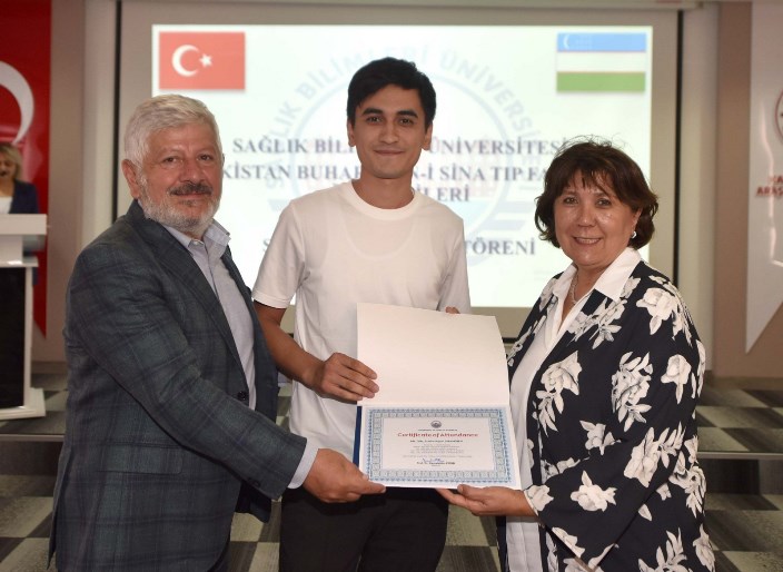 Özbek öğrenciler için Sağlık Bilimleri Üniversitesi Kanuni Eğitim ve Araştırma Hastanesi Numune Kampüsü’nde düzenlenen törene Trabzon Valisi Aziz Yıldırım, Sağlık Bilimleri Üniversitesi Rektörü Prof. Dr. Kemalettin Aydın, Trabzon Üniversitesi Rektörü Prof. Dr. Emin Aşıkkutlu, Trabzon İl Sağlık Müdürü Dr. Mehmet Topsakal, TTSO Başkanı Erkut Çelebi, Semerkand Devlet Tıp Üniversitesi Rektörü Prof. Dr. Casur Alimjanoviç, SBÜ Trabzon Tıp Fakültesi Dekanı Prof. Dr. Ahmet Şen, SBÜ Kanuni Eğitim ve Araştırma Hastanesi Başhekimi Prof. Dr. Hasan Rıza Aydın, Buhara Devlet Tıp Enstitüsü Uluslararası İlişkiler Daire Başkanı Prof. Dr. Elena Aleksandrovna, Sağlık Bilimleri Üniversitesi Özbekistan Birimlerinden Sorumlu Rektör Danışmanı ve İbni Sina Tıp Fakültesi Dekan Vekili Doç. Dr. Aynur Feyzioğlu, Trabzon Büyükşehir Belediyesi Genel Sekreteri Gürkan Üçüncü, Türkiye ve Özbekistan’dan öğretim üyeleri ve diğer ilgililer katıldı.