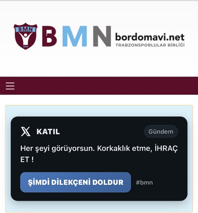 Türkiye’nin en büyük taraftar platformlarından Bordo Mavi.Net yönetiminin Trabzonspor kongre üyelerine “Esaret mi? Cesaret mi?” çağrısı ile başlayan, TFF Başkanı İbrahim Hacıosmanoğlu’nun Trabzonspor Kulübünden ihraç edilmesine yönelik harekete destek çığ gibi büyüyor. Sürekli “adalet ve temiz futbol” söylemini kullanmasına rağmen, Fenerbahçe maçındaki maçın kaderi ile oynayan hakemin hatalarına sessiz kalan TFF Başkanı Hacıosmanoğlu’na Türkiye genelindeki tüm Trabzonsporlu taraftarlar tepkili ve kulüpten derhal ihracı isteniliyor.