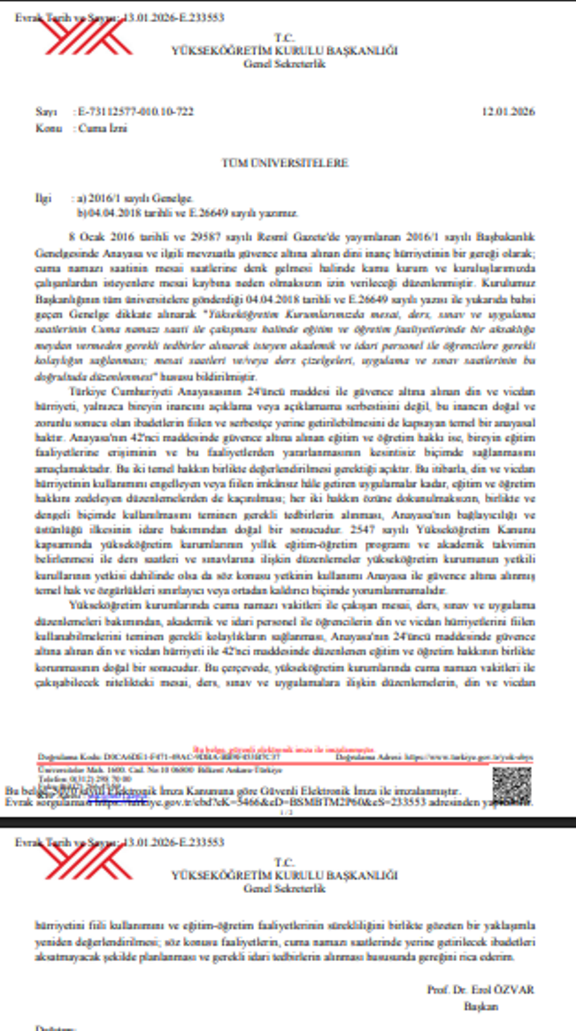 • Üniversitelerde mesai, ders, sınav ve uygulama saatleri herhangi bir dini ibadet esas alınarak yeniden düzenlenemez.