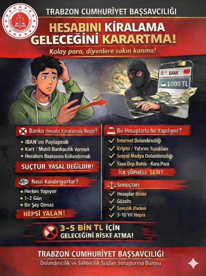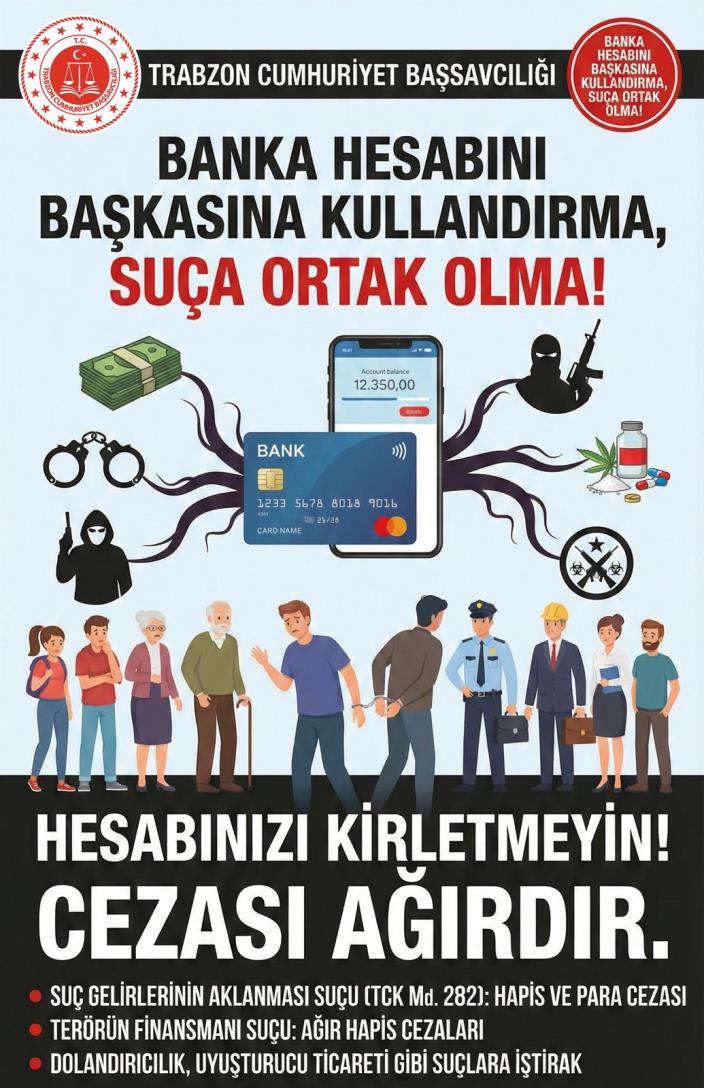 Trabzon Cumhuriyet Başsavcılığınca yürütülen soruşturmalarda; vatandaşların ve özellikle gençlerin önemli bir kısmının, eylemin hukuki ve cezai boyutlarını tam olarak öngöremeden, kısa vadeli kazanç vaatlerine aldanarak banka hesaplarını üçüncü kişilere kullandırmaları nedeniyle şüpheli veya sanık durumuna düştükleri ve haklarındaki yargılama sonucunda mahkemelerce 3 yıldan 10 yıla kadar hapis ve 5.000 güne kadar adlî para cezasına hükmolunabilmektedir. Bu durum, meseleyi yalnızca adli bir süreç olmaktan çıkarıp, vatandaşların ve özellikle gençliğin korunmasına yönelik önleyici tedbirlerin ivedilikle alınmasını gerektiren bir toplumsal sorumluluk hâline getirmiştir.