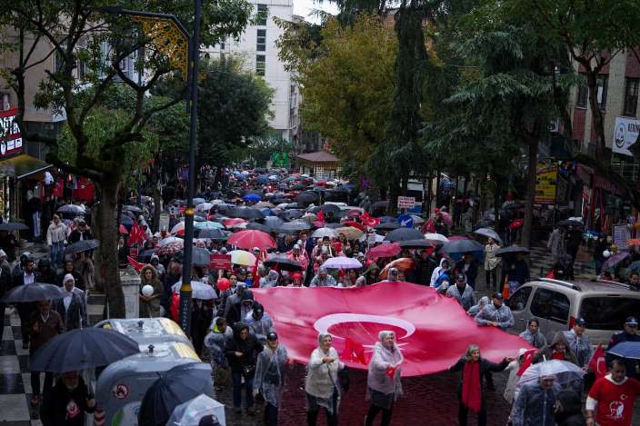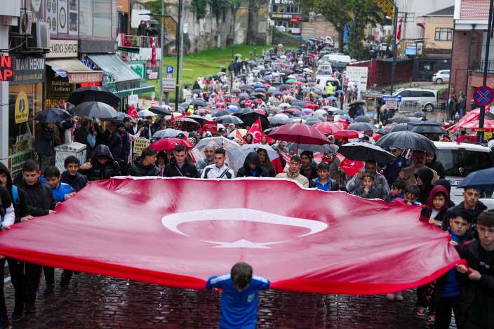 YÜZLERCE KİŞİ, YOĞUN YAĞMUR ALTINDA CUMHURİYET İÇİN YÜRÜDÜ